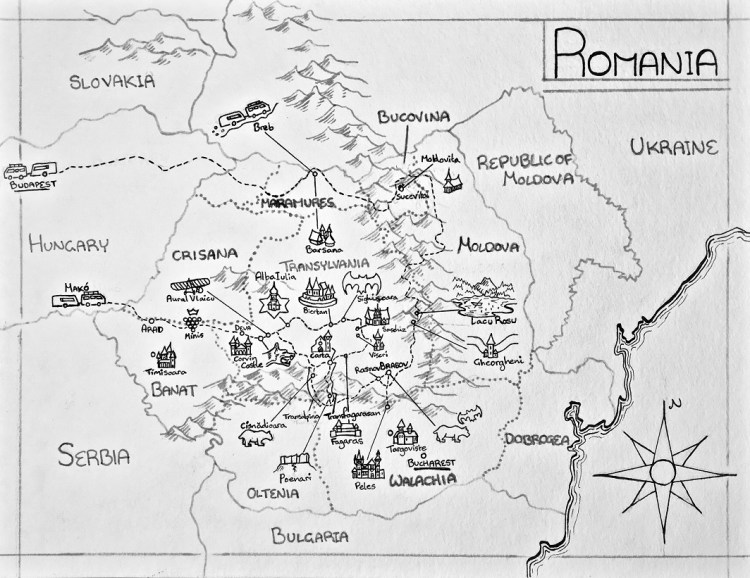 Hand-drawn map of our route through Romania by Elizabeth Barlow-Hall
