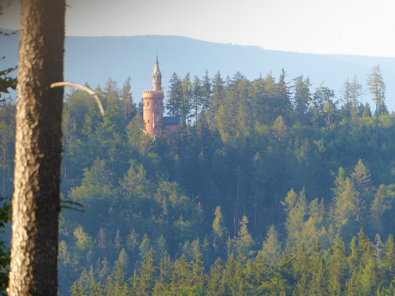 I love it when our caravan loo has a view, and this was the first of our trip. We had a pretty, red sandstone folly on a hill, the Goethe Viewing Tower, and a zip line! That was a brand new experience; watching be-helmeted zippers whizz past our toilet window!