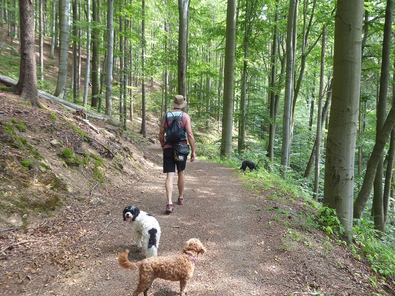 Once we had bypassed the hazards, The Pawsome Foursome got their swim in the lake. Aside from a fleeting sense of danger to life and limb in a new and strange country, it was a pleasant walk through the shady forest. It was hot in the sun, but it wasn’t Provence.