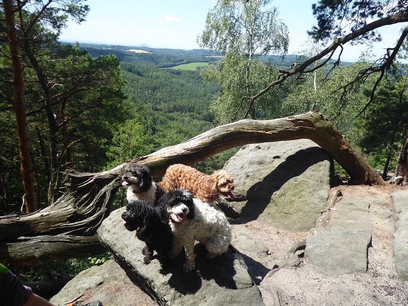 The Pokličky were a few steps from the car park, with a steep climb up a wooden ladder to view them. Then, we followed a circular route, first on a forest track, which was pleasant, but ordinary. “It’s not the Saxon Swiss National Park!” we said. We are so spoiled! Things improved when our route turned into a sunken road with twisted beech roots winding through its banks. This led to an area of fantastic sandstone formations, which we climbed and explored in the dappled sunlight of a beech wood, which never fails to delight me. There were all kinds of impressive pillars and stacks in the forest.