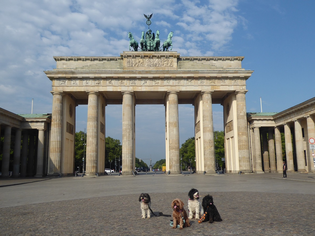 From there, a wide avenue took us through less formal parkland, veined with waterways where we saw a heron fishing. Sadly, even though Frederick used to enjoy Sanssouci with his dogs, our pups had to stay on the lead, even in the bits that looked like pasture.
