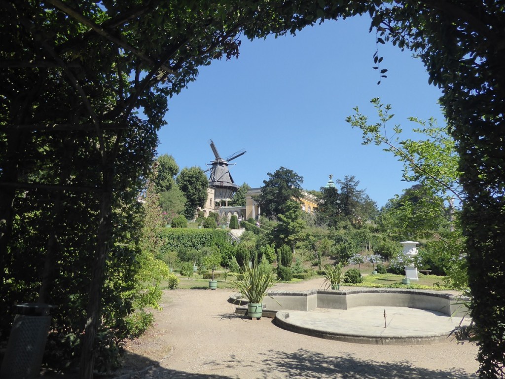 None of that momentous history was evident as we drove through peaceful tree-lined suburbs to Frederick the Great’s summer palace in Sanssouci park. The restored Sanssouci windmill dominated our approach. A giant stone and wooden structure with four forty-foot sails, it towers nearly eighty-five feet into the air.