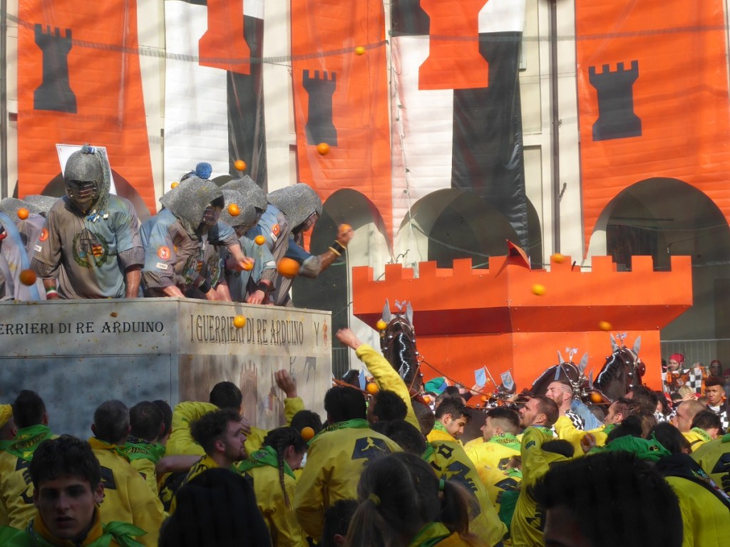 Carnevale is all about freedom from convention and re-living history and tradition. The Italians have a saying, ‘A carnevale ogni scherzo vale,’ which means ‘At carnevale, anything goes. (Ogni scherzo translates literally as ‘any joke’ or trick.) The citizens of Ivrea took this to heart, so in this small corner of Piedmont, the finale of their carnevale manifiests itself as the most red-blooded fruit-flinging festival in the world.