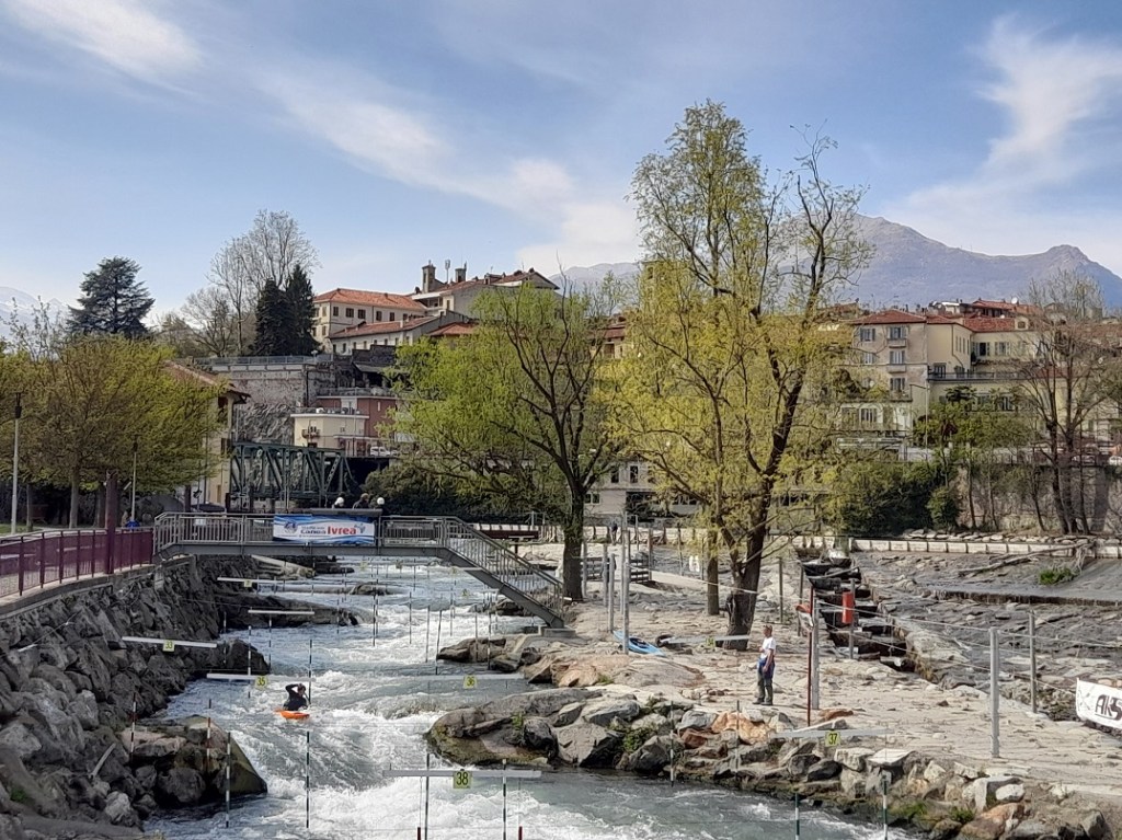 After the overheating brakes, fluctuating oil pressure, and advice that The Beast was in danger of annihilation from drone strikes, it was a relief to amble quietly across the river into Ivrea’s medieval centre. The main bridge overlooks the more ancient Ponte Vecchio and Ivrea’s kayaking club. With a fourteenth-century turreted castle and snow-capped Alpine peaks as a backdrop, it must be the most scenic white water obstacle course in Christendom!