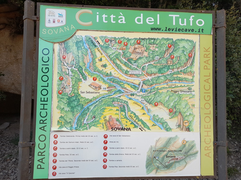 In 1843, English archaeologist S. J. Ainsley discovered an immense necropolis at Sovana. The Archaeological Park Città del Tufo is so called because of the soft, volcanic tufo rock, from which the Etruscans carved staggeringly beautiful and ornate tombs. Vie Cave (singular Via Cava) – sunken roads connected them. Hewn out of solid rock, it is thought these perhaps represent the journey into the underworld, although obviously, we can never be sure. Some speculate that they were defensive structures, that they carried water, or were simply repeatedly re-cut to smooth out the deep ruts caused by the passage of iron-rimmed wagon wheels.