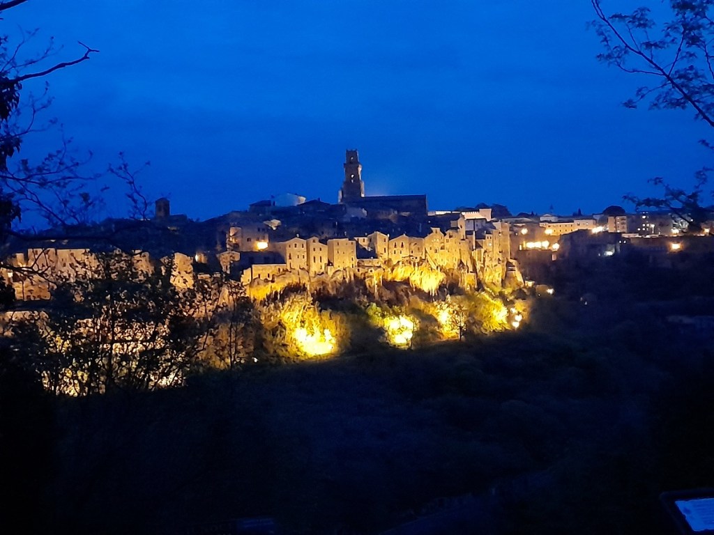 From bed, our view of Pitigliano with its skyline illuminated gold against a velvety royal blue sky, was breathtaking!