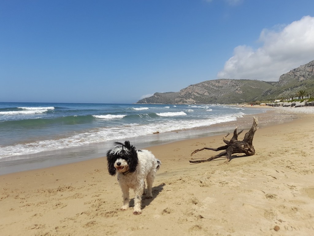It was a wrench to leave Camp Quirino, especially when everyone – and their dogs! – came out to see us off. The only feature I was glad to escape was the plenitude of sand. Beach life with the many paws meant that, between alternate bouts of fury and patient attempts to restore the satnav, Mark took to sweeping out the bed with a dustpan and brush!