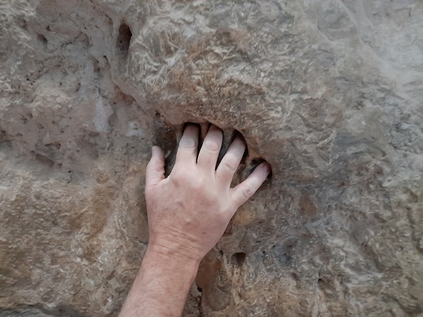 One fissure, The Grotta del Turco – Turk’s Grotto – has a glassy hand print in its rock wall. This was reputedly made by a Saracen pirate who used the area as a hideout. He ridiculed the earthquake theory and said that if it were true, the mountain must be made of cheese. When he touched the rock, it miraculously softened and his fingers left an imprint. According to my interpretation of the Italian translation of the Latin inscription beneath the Mano del Turco, “An unbeliever refused to believe what tradition reports, to prove it, this rock softened at the touch of his fingers.”