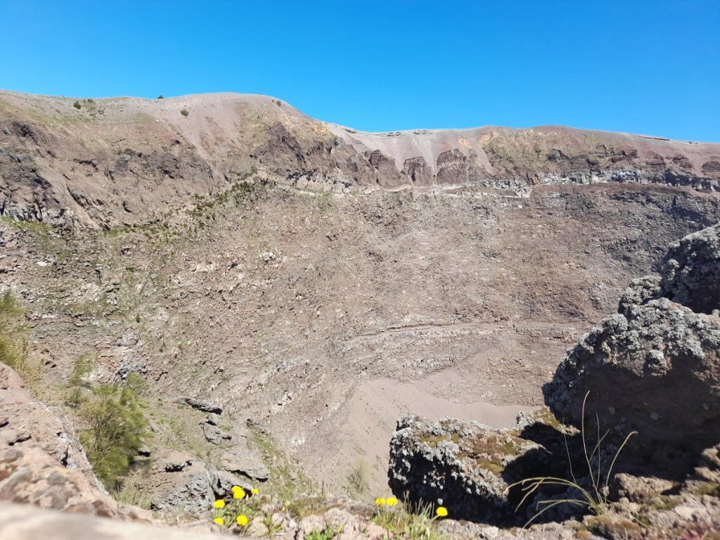 Vesuvio’s current crater is approximately 2,000 feet (about 610 metres) wide and 1,000 feet (305 metres) deep. Flowers graced its rim, which showed the volcano had been quiescent for some time.