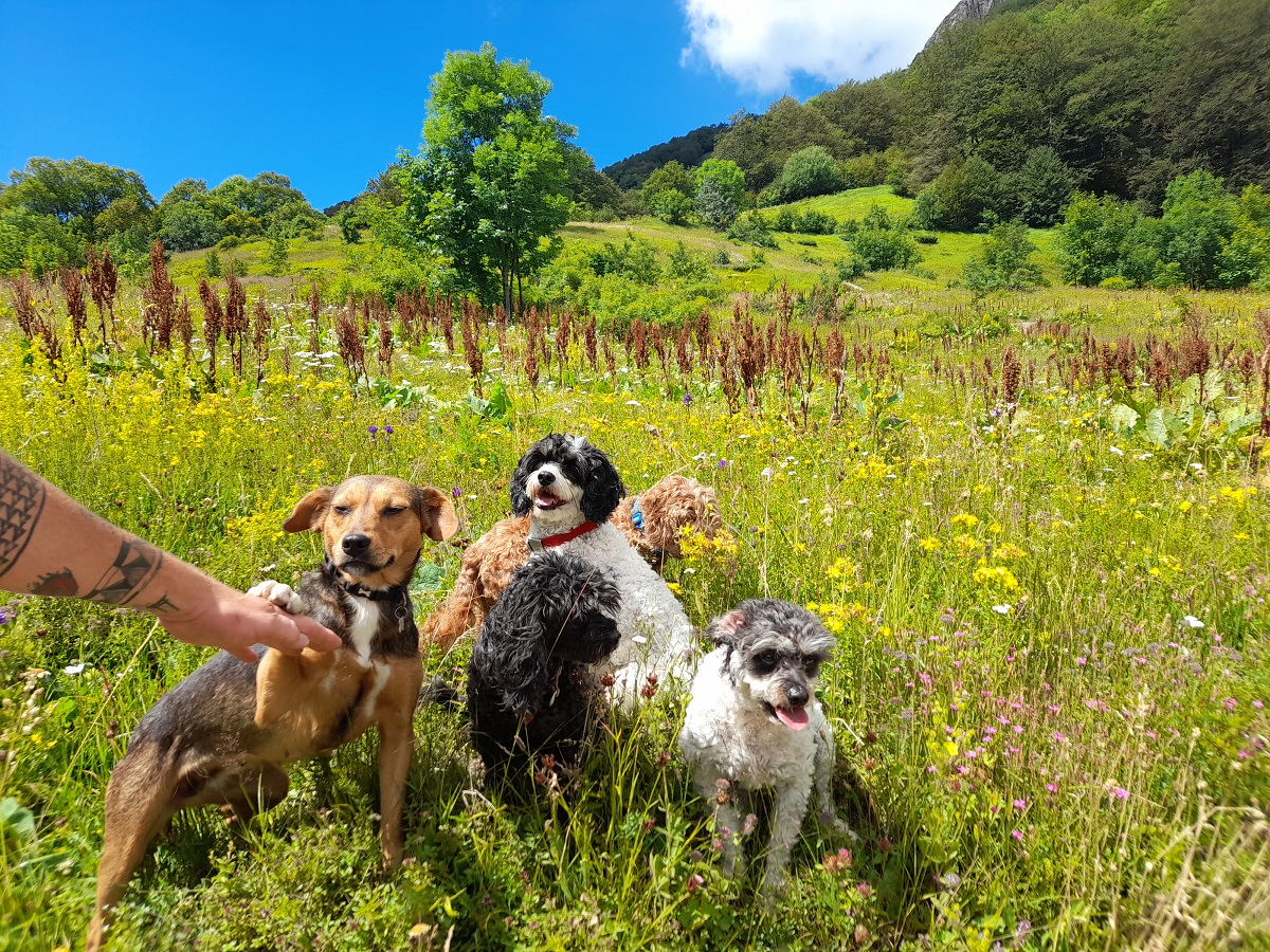 As we gave the pups a well deserved stretch on the forest path by the water, we met new friends and old. A slim black and white Spaniel with a silky coat scrambled over to us, wagging her whole body. We recognised Yllka, who was swiftly followed by Pepjin and Maria, the Dutch couple we’d bumped into at the vets in Fier, Albania.