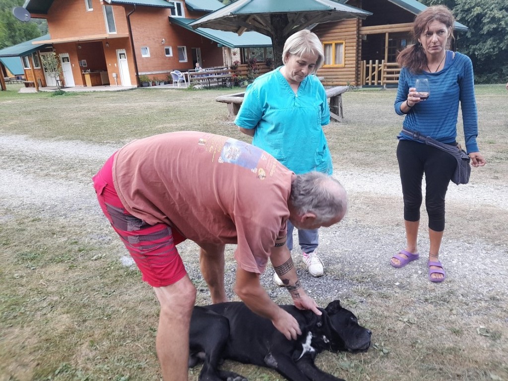 Although they’d only just arrived and we’d only met them a few minutes before, an Italian couple, Simona and Giovanni, shared the vet’s call out fee with us. Giovanni had trained as a vet, but did not practise, and had no medication with him. He explained the dog would need surgery to remove the tumour on his neck.